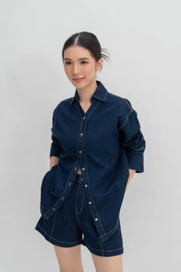 Designed with bold proportions and clean tailoring, this oversized denim shirt-jacket brings structure with ease. Featuring a sharp collar, defined seams, and roomy sleeves, it layers effortlessly or stands alone as a statement.
