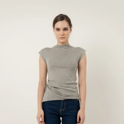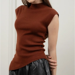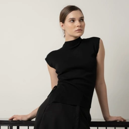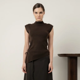 Pose Top - Crafted from a fine, smooth knit, the sleeveless silhouette features a soft mock neckline and structured shoulders for a composed, sculptural shape. At the back, a delicate row of buttons traces the spine, adding quiet detail and contrast to the otherwise minimal front.