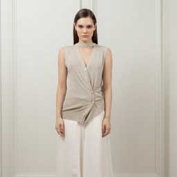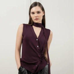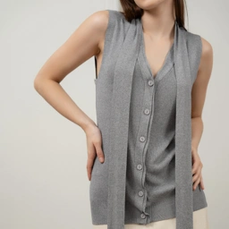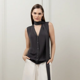 Marlow Top - Crafted from a soft, lightweight knit, the sleeveless silhouette features a clean V-neckline finished with delicate button detailing for a refined front closure. An extended scarf detail drapes effortlessly from the neckline, allowing versatile styling, worn loose, wrapped, or softly tied to shift the mood.