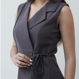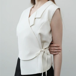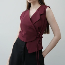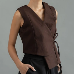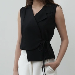 A study in subtle structure, this sleeveless wrap top is crafted in a refined fabric with a clean, architectural silhouette. The asymmetric collar and side tie detail offer quiet intrigue, while the soft tailoring flatters without constraint. Pair it with tailored trousers or fluid skirts for a look that transitions effortlessly from day to evening.