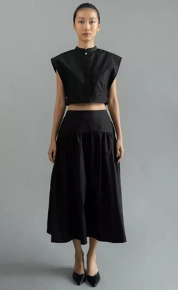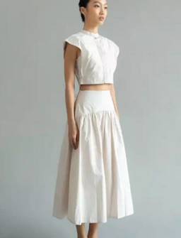 Crafted from crisp cotton, this voluminous A-line skirt offers a sculpted silhouette that moves with ease. Designed with a contoured waist that cinches at the waist before falling into soft gathers, it brings understated drama to everyday dressing. An invisible side zip closure ensures a clean, seamless fit.