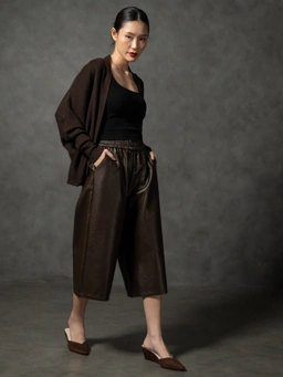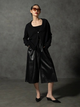 Ankara’s signature quiet confidence is distilled in the Reeves Culottes. Crafted from a supple, softly draped faux leather, the silhouette falls into a structured 3/4 length wide leg that moves with understated ease. The elasticated waistband is intentionally gathered for a clean, uninterrupted line while offering exceptional comfort. Side pockets to maintain practicality.