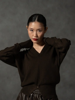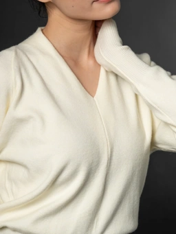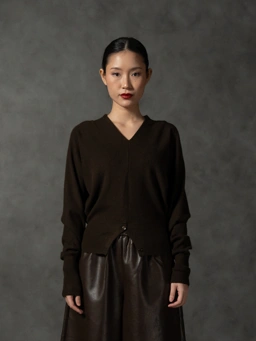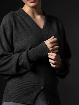 Syra V-neck knit top features a relaxed, draped silhouette that tapers into a clean, ribbed hem for a softly cinched finish. Detailed with double-button accent at the front hem creating a gentle opening that elevates the piece from simple to thoughtfully designed.