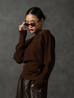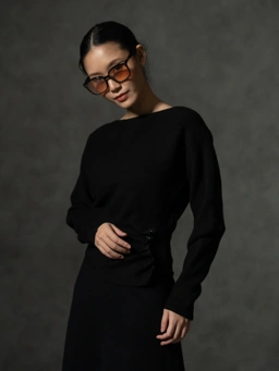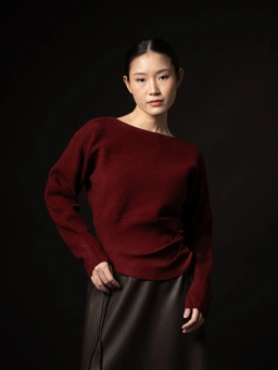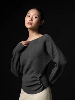 Mave sabrina sweater features a clean, wide neckline and a fluid silhouette that gently tapers into a sculpted waist. The waist panel is crafted with subtle ribbing and finished with an artful side ruched detail, created through a line of refined mini-buttons.